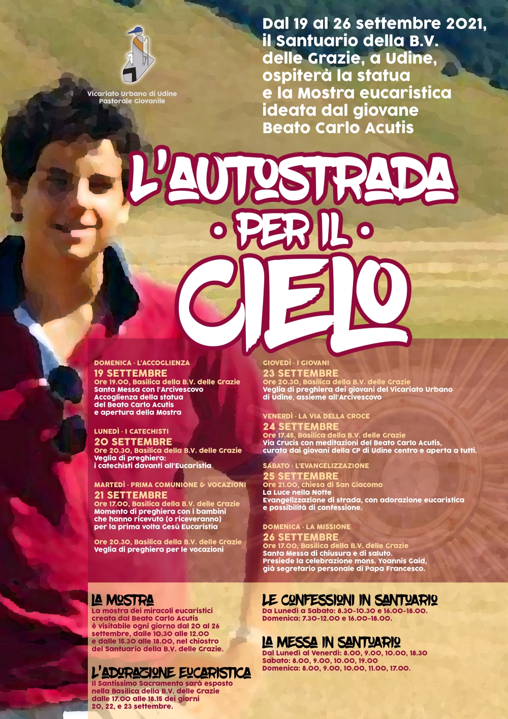 Dopo l’esperienza della CP di Basiliano, anche il Vicariato di Udine ospita la mostra sui Miracoli Eucaristici ideata dal giovanissimo Beato Carlo Acutis. Dal 19 al 26 settembre il Santuario della B.V. delle Grazie ospiterà non soltanto la mostra, ma anche la statua e una reliquia del Beato. Un ricco programma di iniziative coinvolgerà bambini, giovani, catechisti e chiunque desideri sostare in preghiera. Le iniziative sono coordinate dalla Pastorale Giovanile del Vicariato Urbano di Udine.