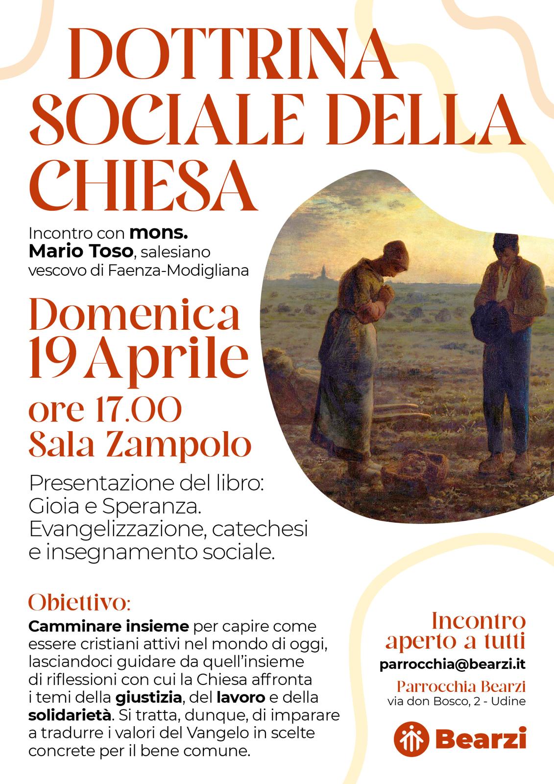 Domenica 19 aprile 2026 presso l’istituto salesiano Bearzi in via don Bosco 2 a Udine alle ore 17.00 in Sala Zamolo il Gruppo di studio della Dottrina sociale della Chiesa organizza la presentazione del libro “Gioia e Speranza. evangelizzazione, catechesi e insegnamento sociale“. Sarà presente mons. Mario Toso, salesiano vescovo di Faenza- Modigliana. L’incontro è aperto a tutti.