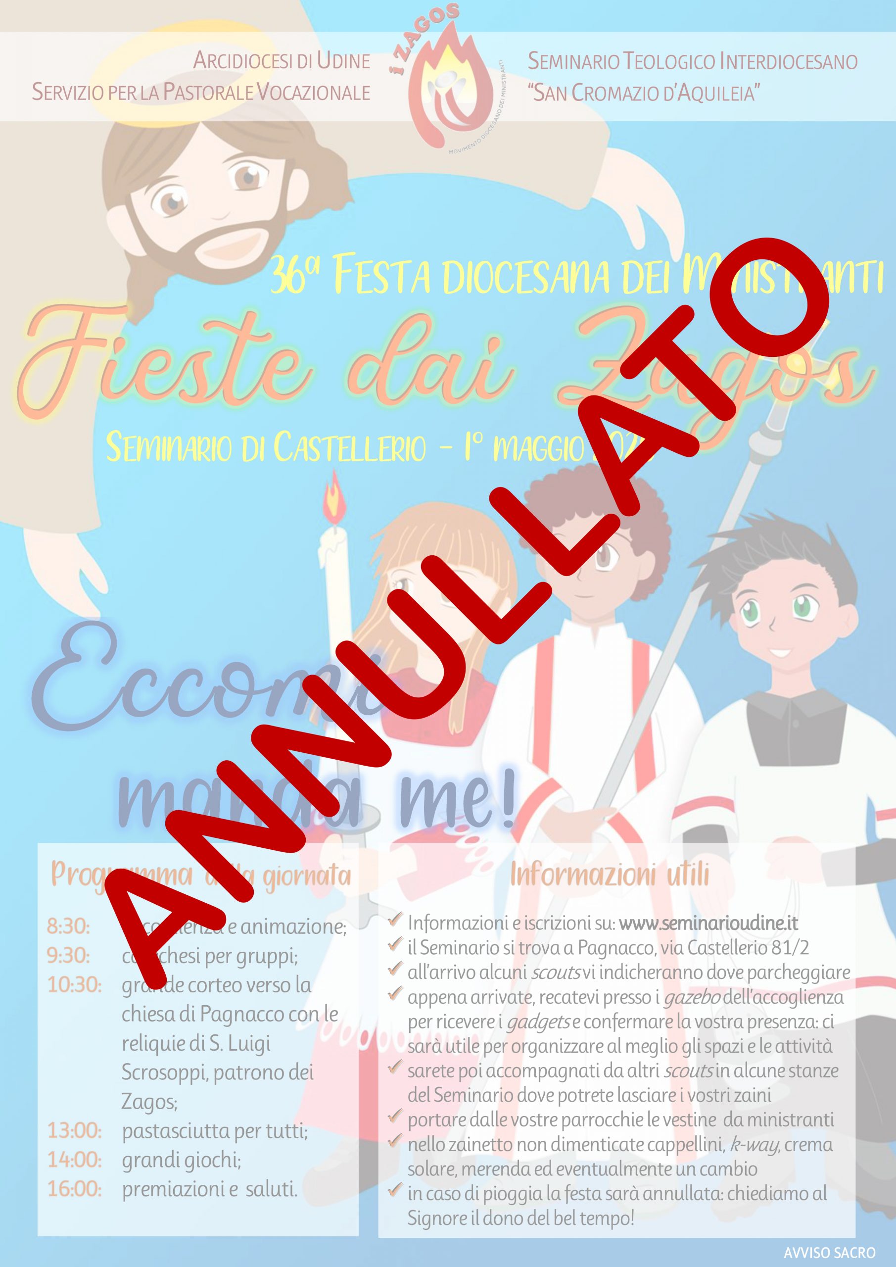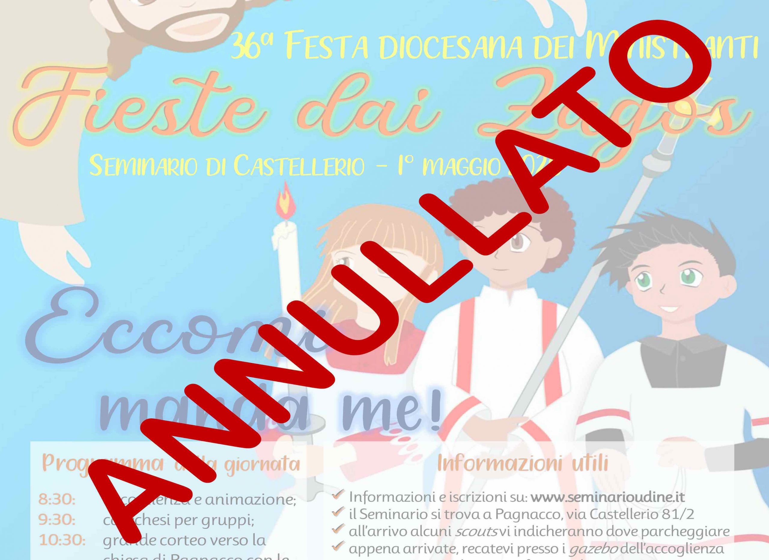 In ottemperanza alle ultime indicazioni date dal nostro Arcivescovo, l’equipe di Pastorale Vocazionale comunica che la Festa dei Ministranti 2020 è annullata. L’animazione e la formazione del gruppo Zagos riprenderanno in autunno con l’inizio del nuovo Anno Pastorale, momento in cui tutti noi speriamo sarà cessata questa situazione di emergenza.