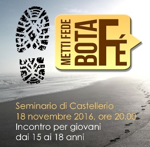 Dopo la veglia di inizio anno dello scorso 14 ottobre, ritorna l’appuntamento con “Bota fé – Metti fede”, l’itinerario di spiritualità per adolescenti. Venerdì 18 novembre, infatti, avrà luogo la prima delle tre tappe “Bota fé” in Seminario. L’incontro inizierà puntualmente alle 20.00 (attenzione: non 20.30). Giorno e orario differiscono rispetto alla proposta dell’anno scorso, per facilitare la partecipazione di diversi gruppi.