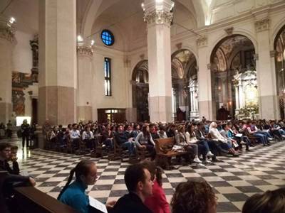 L’icona biblica di Maria e degli apostoli nel giorno della Pentecoste ha tracciato il cammino spirituale della serata. L’immagine stessa – riproduzione di quella realizzata da p. Rupnik per il santuario “Giovanni Paolo II” di Cracovia – è stata accolta e proiettata durante la veglia, come una immagine che, come ha ben suggerito l’Arcivescovo nella sua omelia, «rappresenta efficacemente la concordia della prima Chiesa: essere concordi significa “avere un cuore solo”».