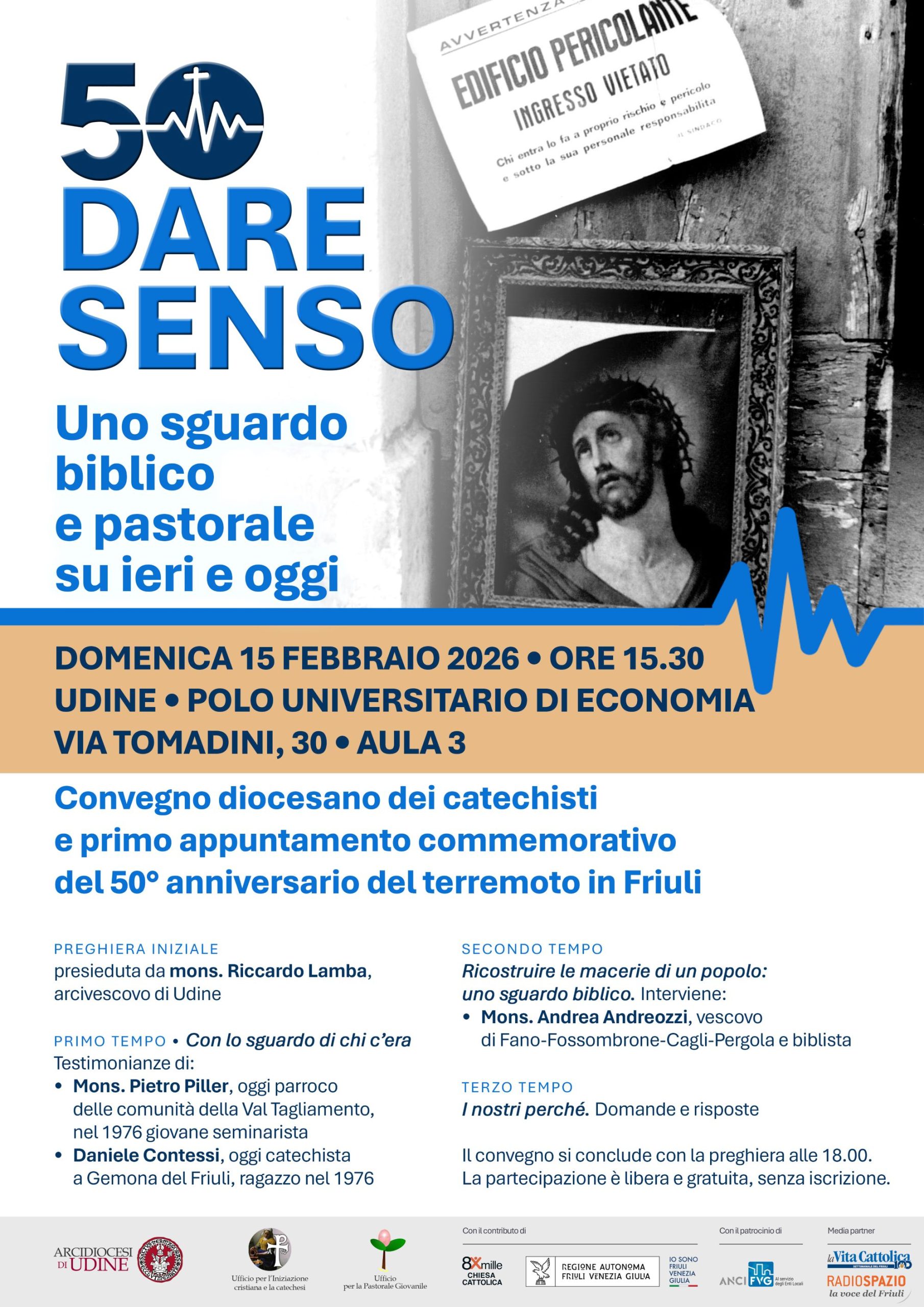 Domenica 15 febbraio 2026 il primo dei convegni con cui la Chiesa udinese ricorda il 50° anniversario del terremoto del 1976 coincide con l’annuale appuntamento per i catechisti. Un’occasione per leggere la presenza di Dio nei drammi della storia e del presente. Due testimonianze e le parole del vescovo biblista mons. Andrea Andreozzi.