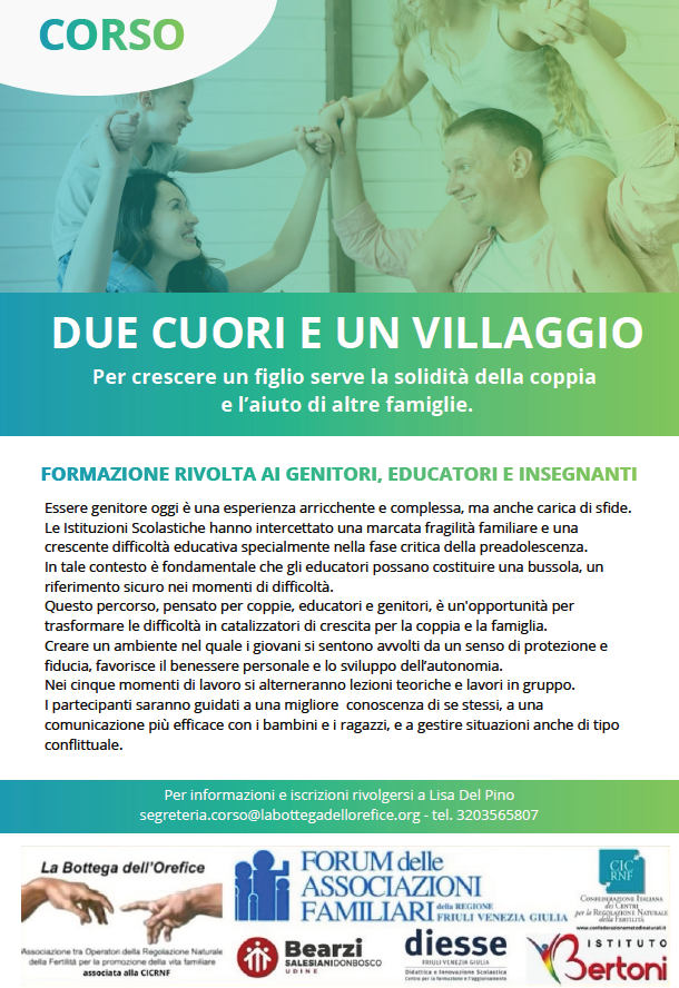 Gli incontri sono organizzati insieme da La bottega dell’orefice, Forum delle Associazioni Familiari FVG, Confederazione Italiana dei Centri per la Regolazione Naturale della Fertilità, Bearzi, Diesse e Istituto Bertoni.