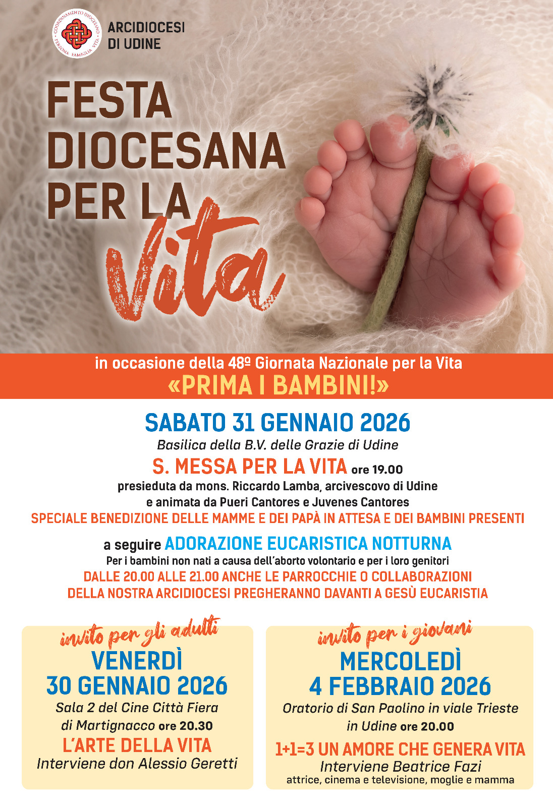 Anche quest’anno la Pastorale Giovanile diocesana ha a cuore la tematica e la preghiera in occasione della 48° Giornata Nazionale per la Vita, che si celebrerà domenica 1° febbraio 2026. Il tema scelto dai Vescovi italiani è «Prima i bambini». [link al messaggio]