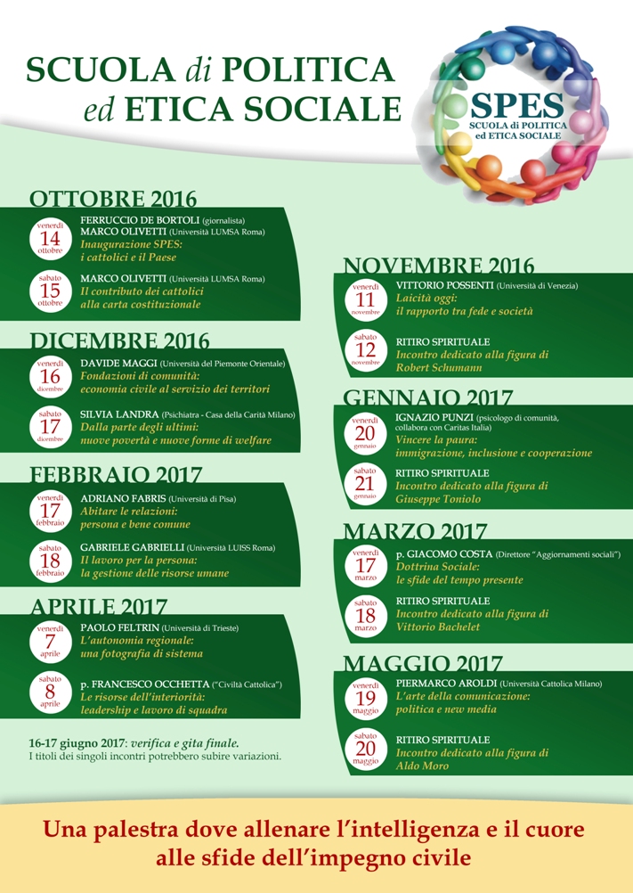 Una realtà quella voluta dalla Diocesi che si propone come un luogo di imparzialità rispetto alla contrapposizione partitica proprio perché la Scuola vuole essere un terreno d’incontro tra le diverse sensibilità politiche, nel quale addestrarsi al dialogo costruttivo. «Imparzialità – precisa il Direttore – non significa però neutralità, poiché il terreno d’incontro proposto è quello disegnato dall’insegnamento della Dottrina Sociale della Chiesa, un patrimonio nel quale possono ritrovarsi “tutti gli uomini di buona volontà” ». Non solo. Per chi lo vorrà, infatti, ci sarà la possibilità di seguire un cammino spirituale che aiuti a consolidare la vita interiore attraverso la conoscenza e l’incontro con alcuni dei grandi maestri del Novecento – Robert Schumann, Giuseppe Toniolo, Vittorio Bachelet e Aldo Moro – «testimoni credibili di come fede, speranza e carità possano incarnarsi nell’esercizio concreto dell’azione politica».