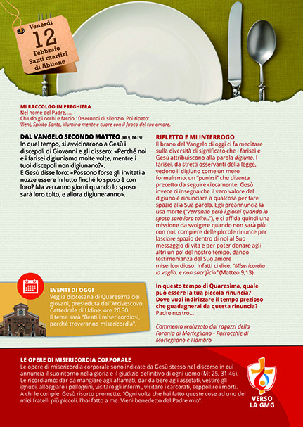 Ogni giorno il sussidio presenta un momento iniziale per “entrare in preghiera”, il Vangelo quotidiano e un breve commento. Pagina dopo pagina, inoltre, è presente un ulteriore approfondimento intitolato “Verso la GMG”, offerto a tutti e in particolar modo a chi desidera partecipare alla Giornata Mondiale della Gioventù di Cracovia. Nella Quaresima 2016, l’approfondimento riguarda le opere di misericordia corporali e spirituali. I testi sono tratti dal sussidio “Beati i misericordiosi, perché troveranno Misericordia” e dalla Lettera Pastorale “Eterna è la sua misericordia”. Nei giorni in cui cadono particolari eventi (veglie, Bota fé, ecc.), il sussidio propone un piccolo promemoria.