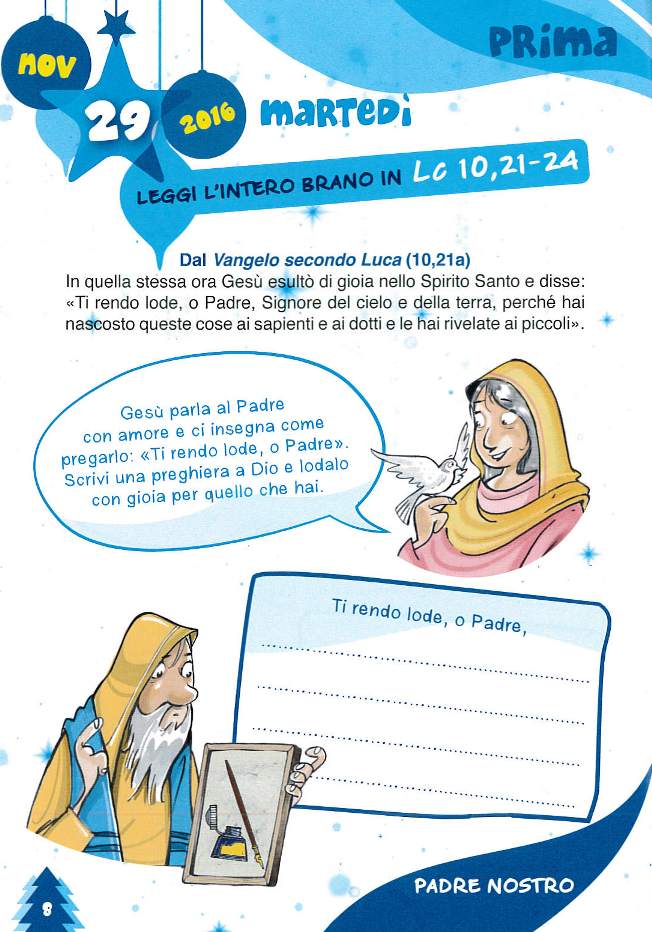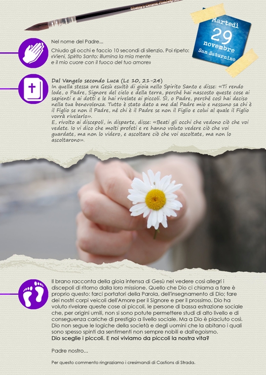Ogni giorno il sussidio presenta un momento iniziale per “entrare in preghiera”, il Vangelo quotidiano e un breve commento.