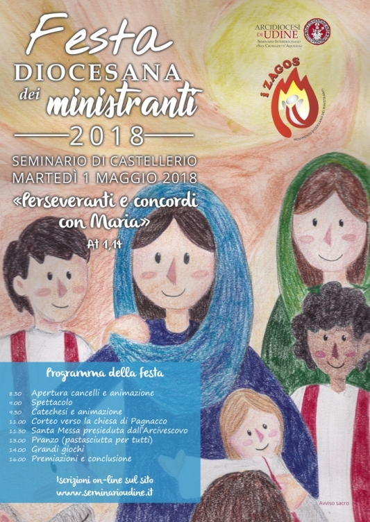 Nell’Arcidiocesi di Udine, il primo maggio è un giorno dedicato all’ormai tradizionale Festa diocesana dei ministranti, che come l’anno scorso avrà luogo in Seminario a Castellerio (Pagnacco). Il tema della festa – che tipicamente ispira la realizzazione dei variopinti cartelloni e striscioni – è lo stesso che l’Arcivescovo Andrea Bruno ha scelto per la Lettera Pastorale 2017-2018: «Perseveranti e concordi con Maria» (At 1,14).