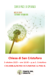 A conclusione del Tempo del Creato «Semi di pace e di speranza» che si è svolto dal 1′ settembre al 4 ottobre 2025, venerdì 3 ottobre 2025 alle ore 18.00 presso la Chiesa di San Cristoforo in Udine si svolgerà una celebrazione ecumenica per il Tempo del Creato.