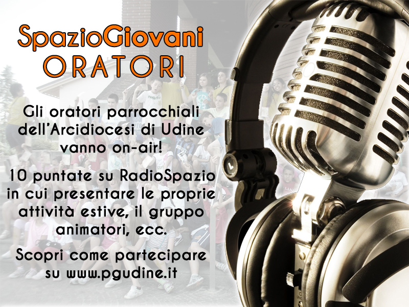 SpazioGiovani “oratori” è una rubrica settimanale su Radio Spazio, curata dall’Ufficio diocesano di Pastorale Giovanile e dalla redazione di Radio Spazio. La messa in onda è prevista dalla settimana successiva alla Pasqua (metà aprile 2017) fino a fine giugno 2017. Si tratta di 10 appuntamenti a cadenza settimanale (giorno e orario da definire).Ogni appuntamento, della durata di 20 minuti circa, prevede: