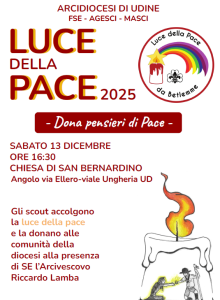 Mentre nel pomeriggio a Udine, alle ore 16.30 presso la chiesa di S. Bernardino (Angolo via Ellero – viale Ungheria), alla presenza dell’arcivescovo mons. Riccardo Lamba, ci sarà l’accoglienza della luce della pace in città.