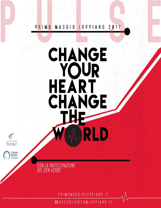 «Pulse» è il nome del grande evento mondiale in programma lunedì 1° maggio 2017 a Loppiano (FI), la Mariapoli toscana del movimento dei focolari. Si tratta dell’appuntamento mondiale che inaugura l’edizione 2017 della Settimana Mondo Unito, una giornata che vedrà giovani di oltre 40 Paesi uniti per mostrare a tutti il vero “battito” dell’umanità: le infinite azioni di pace e fraternità che popolano la vita di singoli, gruppi e popoli. Idee in musica, coreografie, parole, testimonianze e spazi di dialogo su politica, economia, arte, religione, cultura, impegno sociale a favore della pace. All’evento parteciperanno anche i Gen Verde.