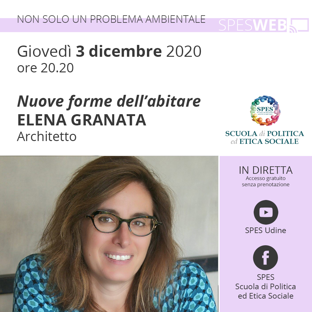 Giovedì prossimo – 3 dicembre 2020 – dalle 20:30, si svolgerà la nuova diretta social del ciclo SPES WEB. Sarà ospite Elena Granata, urbanista, che affronterà il tema legato alle nuove forme abitative sospinte dall’attuale contesto sociale e, non ultima, dalla pandemia. L’incontro si inserisce nel mini-ciclo denominato «Alle radici del problema», all’interno del quale è già intervenuta la psichiatra e psicoterapeuta Silvia Landra.