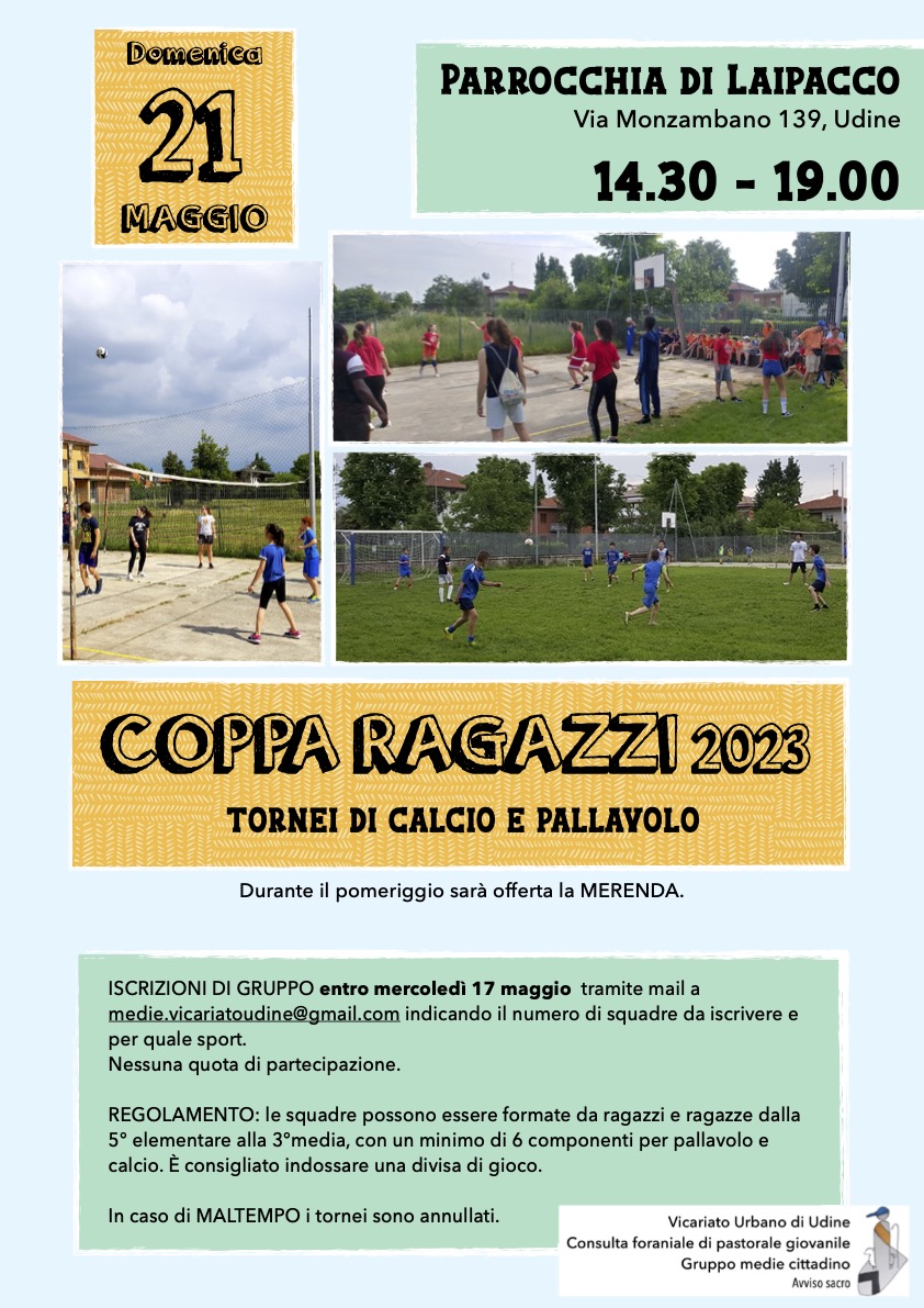 Il Vicariato Urbano di Udine, la Consulta Foraniale di Pastorale Giovanile e il Gruppo Medie Cittadino ripropongono i tornei sportivi per i ragazzi del Vicariato Urbano di Udine, con i tradizionali calcio e pallavolo.