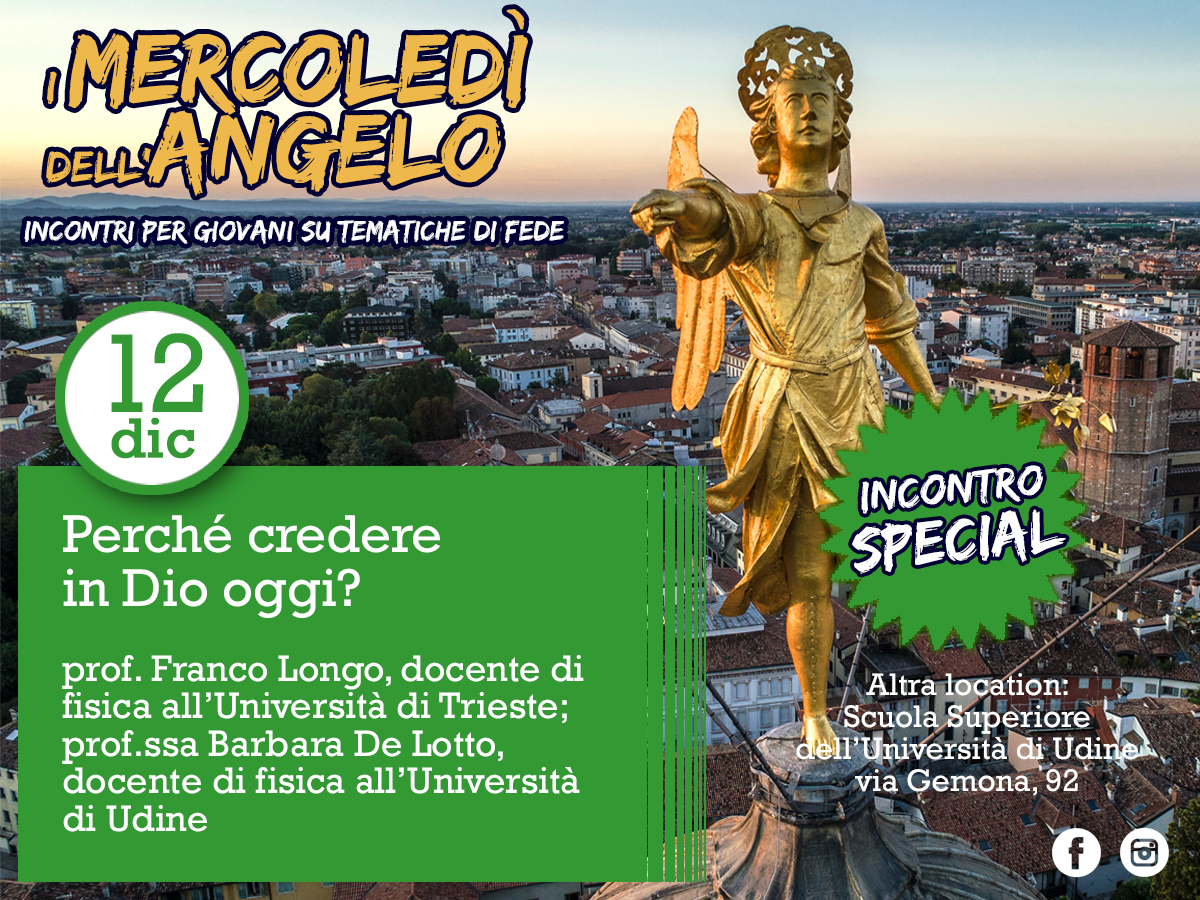 Ospiti di questo secondo appuntamento – che avrà luogo mercoledì 12 dicembre alle 20.30 e straordinariamente si svolgerà nella sede della Scuola Superiore dell’Università di Udine, in via Gemona 82 – saranno due docenti di fisica: Franco Longo, dell’università di Trieste, porterà il punto di vista di uno scienziato credente. La prof.ssa Barbara De Lotto dell’Università di Udine, invece, sosterrà la tesi opposta.