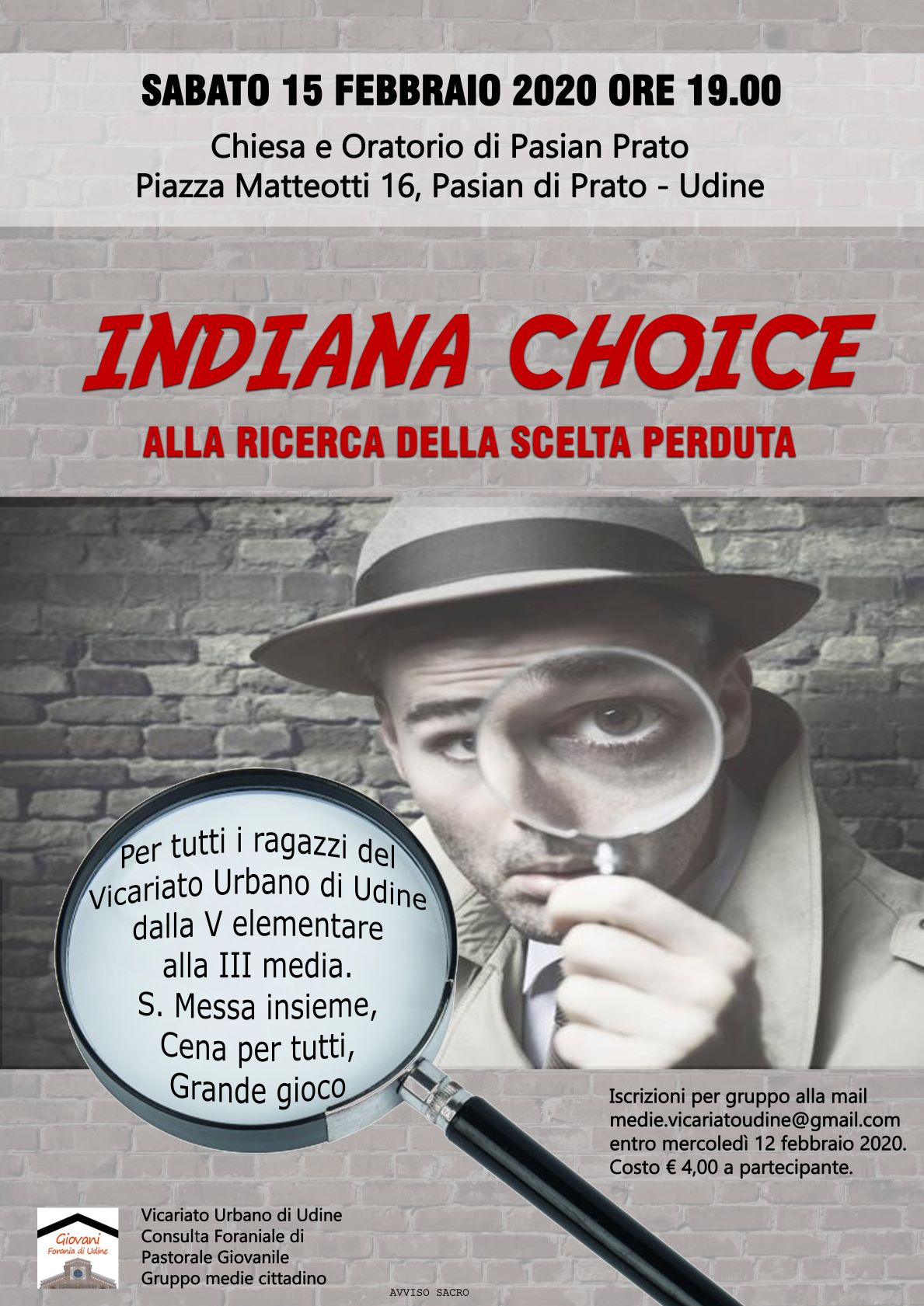 Si svolgerà sabato 15 febbraio la tradizionale serata di animazione per tutti i gruppi di pre-adolescenti del Vicariato Urbano di Udine. «Indiana Choice – Alla ricerca della scelta perduta» è il titolo della serata, che avrà luogo nella parrocchia di Pasian di Prato. Questo appuntamento è organizzato dalla Pastorale Giovanile del Vicariato Urbano di Udine, in particolare dal «gruppo medie cittadino».
