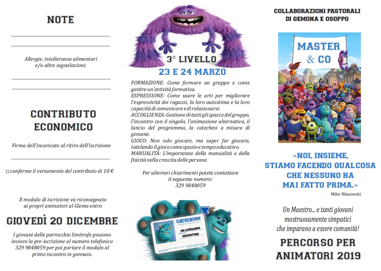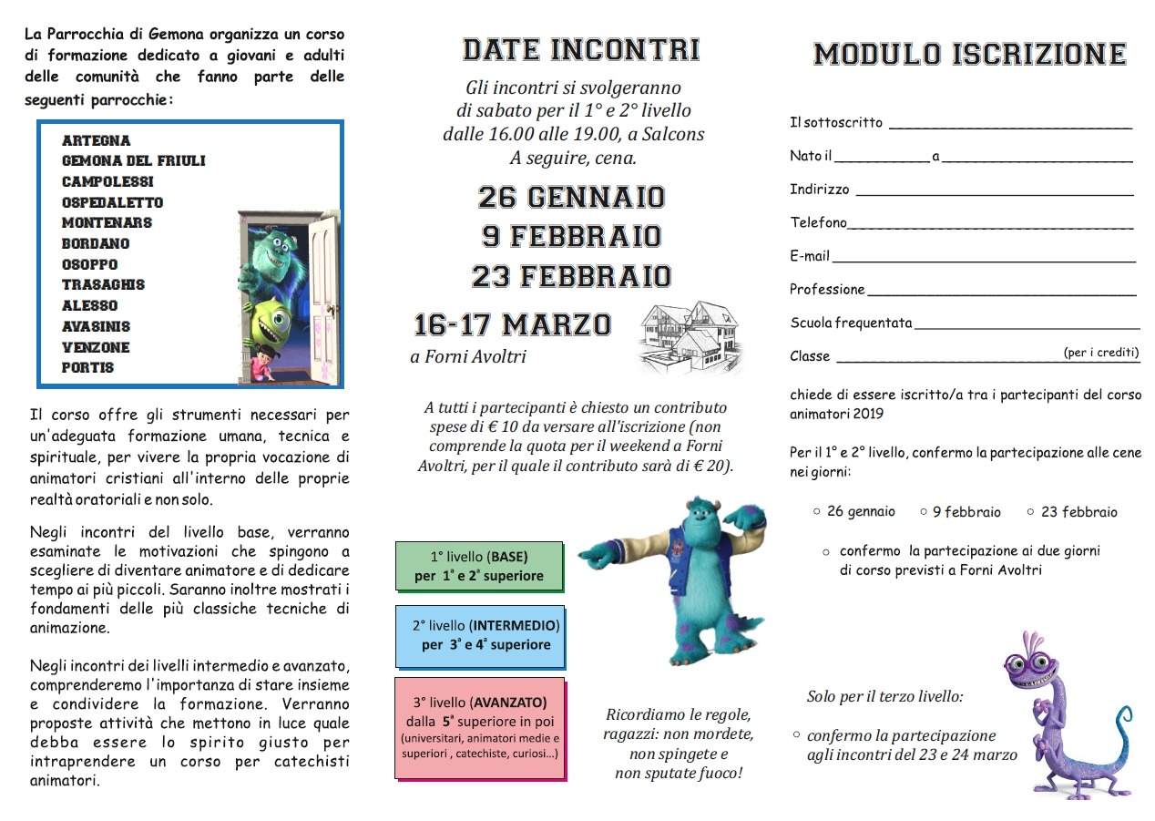 Le Collaborazioni Pastorali di Gemona e di Osoppo organizzano un corso animatori sviluppato tra il 26 gennaio e il 17 marzo 2019. Destinatari del corso sono tutti coloro – giovani e adulti – che offrono tempo e passione al servizio educativo delle nuove generazioni. In particolare, il corso si rivolge agli animatori che fanno riferimento al bacino delle Parrocchie di: Artegna, Gemona, Campolessi, Ospedaletto, Montenars, Bordano, Osoppo, Trasaghis, Alesso, Avasinis, Venzone, Portis.