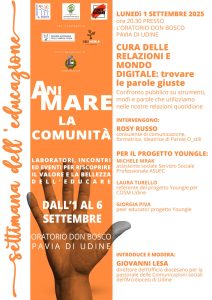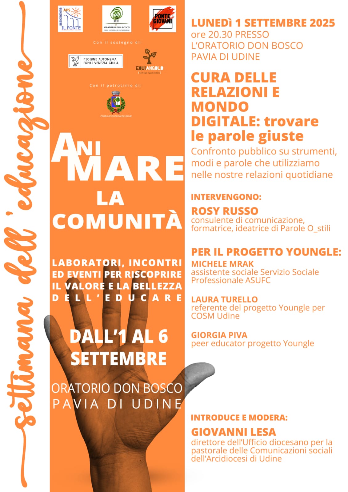 Lunedì 1 settembre 2025 alle ore 20.30 presso l’oratorio don Bosco a Pavia di Udine incontro pubblico dedicato agli strumenti, modi e parole che utilizziamo nelle nostre relazioni quotidiane: «Cura delle relazioni e mondo digitale: trovare le parole giuste».
