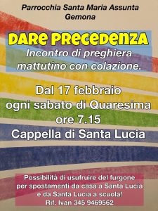 La parrocchia di Santa Maria Assunta in Gemona nei sabati di quaresima propone ogni sabato un incontro di preghiera mattutino che si conclude con la colazione.