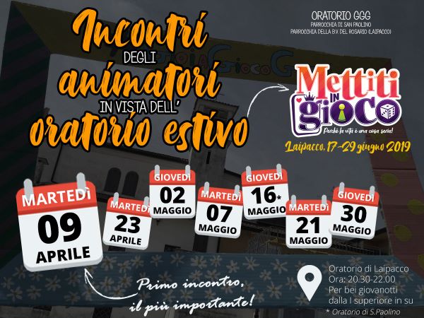 È iniziato il percorso formativo degli animatori dell’oratorio cittadino di San Paolino e Laipacco, in vista dell’oratorio estivo previsto nei pomeriggi dal 17 al 29 giugno prossimi, che avrà per tema «Mettiti in gioco!».