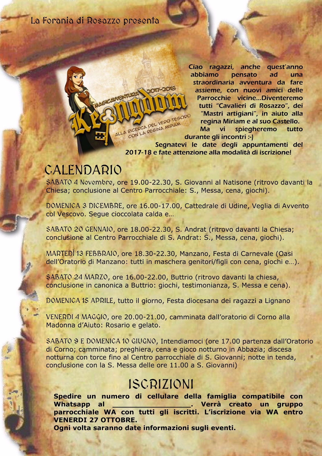 In occasione della MagicAvventura 2017-2018 “KEYngdom”, le Parrocchie della Forania di Rosazzo hanno unito le forze per proporre ai propri pre-adolescenti alcune iniziative il più coinvolgenti possibile. Ecco nascere, quindi, i “Cavalieri di Rosazzo”, un gruppo di ragazzi provenienti dai diversi gruppi-medie della Forania. A cadenza mensile, i Cavalieri si ritrovano per svolgere alcune attività insieme, iniziative coordinate dai rispettivi animatori e catechisti. Il gruppo, inoltre, partecipa unitariamente alla MagicAvventura diocesana.