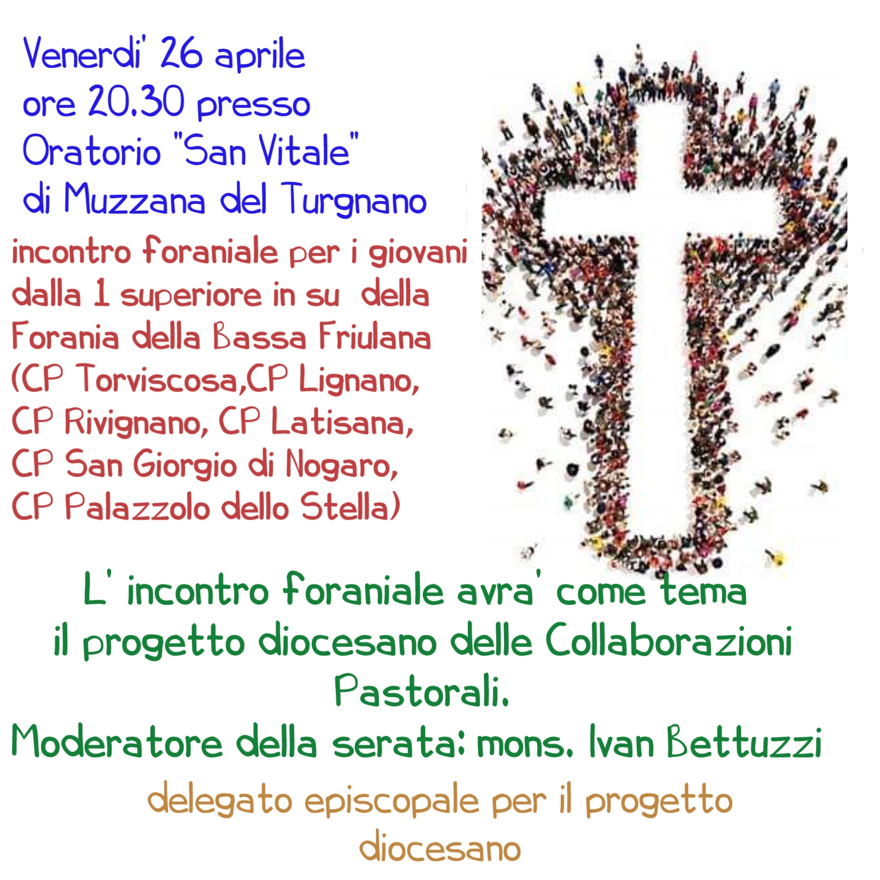 I sacerdoti della Forania della Bassa Friulana (formata dalle Collaborazioni Pastorali di: Rivignano, San Giorgio di Nogaro, Torviscosa, Latisana, Lignano e Palazzolo dello Stella), nei mesi scorsi, hanno riflettuto su come coinvolgere i più giovani nel progetto diocesano delle Collaborazioni Pastorali, con l’intento di coinvolgere esattamente coloro che porteranno a pieno compimento il progetto diocesano delle CP e che costruiranno la Chiesa friulana nel futuro. Date queste premesse è stata promossa una serata foraniale dedicata a tutti i giovani (specialmente coloro i quali fossero impegnati in parrocchia anche con piccoli servizi) dalla 1° superiore in su che si terrà venerdì 26 aprile alle ore 20.30 nell’Oratorio “San Vitale Martire” di Muzzana del Turgnano.