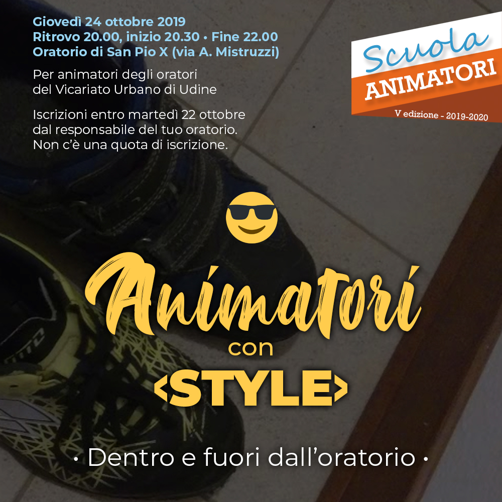 - Giovedì 24 ottobre 2019, ore 20.00, Oratorio di San Pio X: «Animatore di stile: dentro e fuori dall’oratorio».