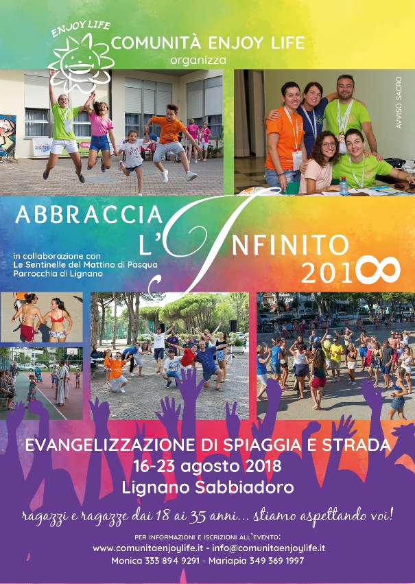 Dopo la fortunata iniziativa dello scorso anno, la parrocchia di Lignano, insieme all’associazione di volontariato Enjoy life, rilancia la missione «Abbraccia l’infinito», nella sua seconda edizione. Una vera e propria proposta di evangelizzazione sull’arenile (e non solo), pensata dai giovani, per i giovani, ma rivolta anche agli adulti. Dal 16 al 23 agosto a Sabbiadoro, un centinaio di ragazzi percorrerà le strade e la spiaggia della località balneare per annunciare il Vangelo. Giovani con il coraggio di buttarsi, di mettersi in gioco. Giovani che hanno scoperto la dimensione autentica di una vita piena e provano una gioia talmente grande da sentire il bisogno di farla intuire anche ai loro coetanei.