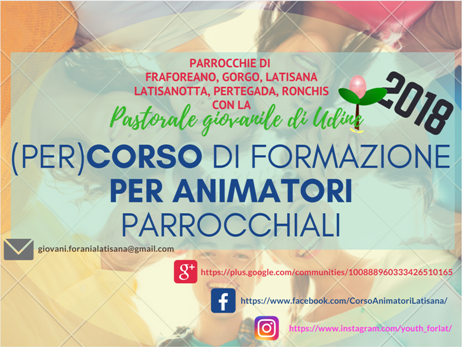 Un interessante progetto formativo ha preso forma nella zona pastorale di Latisana, per adolescenti e giovani delle Parrocchie di Latisana, Latisanotta, Fraforeano, Gorgo, Ronchis e Pertegada che desiderano cimentarsi nel servizio di animazione in oratorio. L’itinerario formativo – che si sviluppa in due livelli (c.d. “animatori junior” e “senior”) – è sviluppato assieme all’ufficio diocesano di Pastorale Giovanile di Udine.
