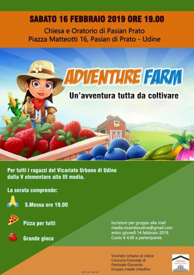 Si chiama «Adventure Farm – Un’avventura tutta da coltivare» ed è una serata di preghiera e animazione per i pre-adolescenti del Vicariato Urbano. Sembra una cosa banale, invece la sera di sabato 16 febbraio sarà una bella festa per tutti i ragazzi del Vicariato Urbano, dalla V elementare alla III media.