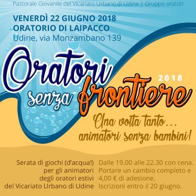 La serata, che inizialmente era prevista per venerdì 22 giugno, è stata spostata a martedì 26 giugno nell’oratorio di Laipacco (Udine, via Monzambano 139), inizierà alle 19.00 con i giochi e si concluderà attorno alle 22.30 dopo la cena e un breve momento di preghiera. Alla serata sono previsti giochi d’acqua. I partecipanti, quindi, sono invitati a indossare il costume da bagno sotto all’abbigliamento e a portare un cambio completo. A copertura delle spese, ciascun partecipante avrà una quota di iscrizione di 4,00 €.
