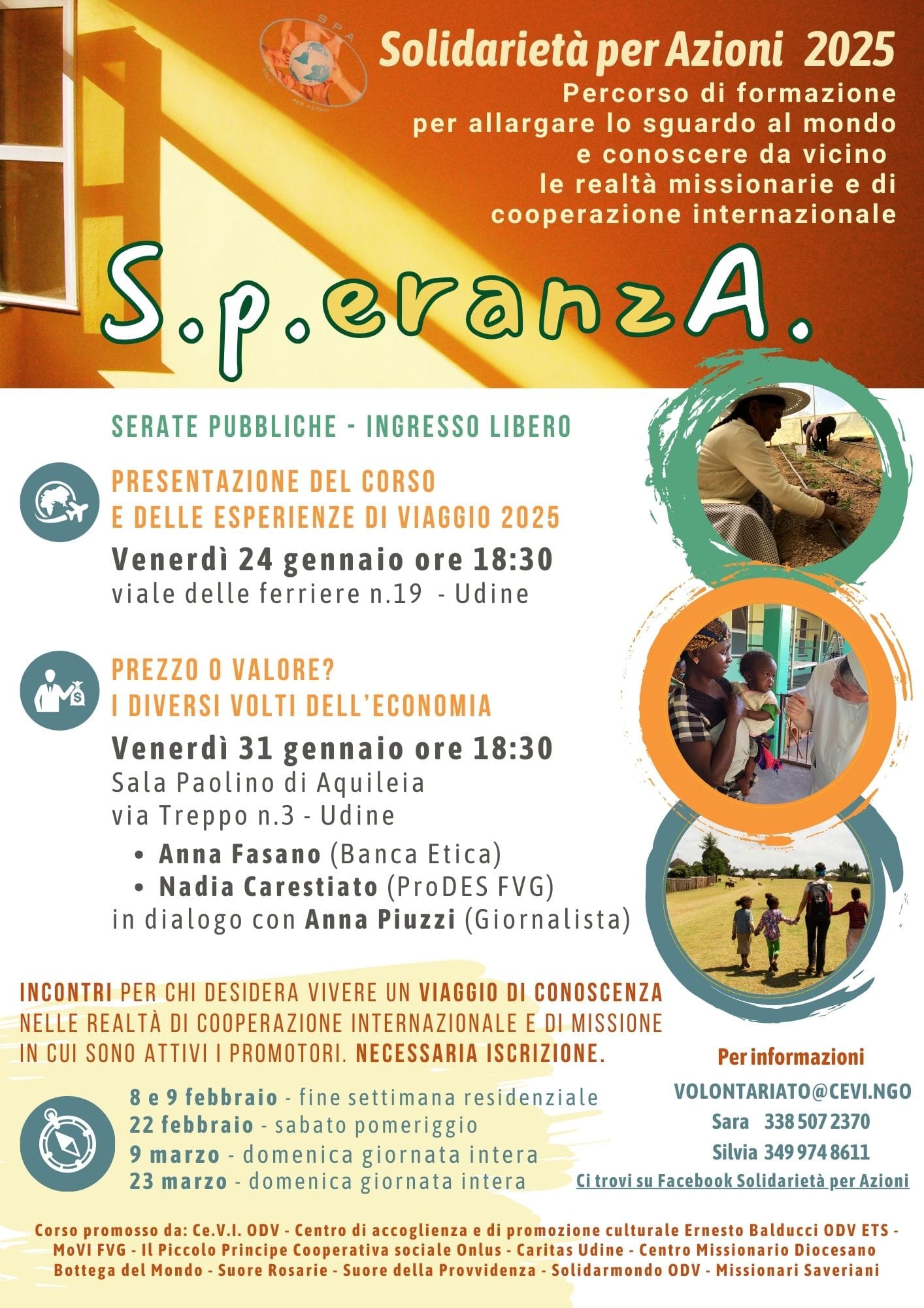 S.P.A. ovvero Solidarietà per Azioni è un percorso di formazione per allargare lo sguardo al mondo e conoscere da vicino le realtà missionarie e di cooperazione internazionale. L’edizione 2025 si chiama «S.p.eranzA.».