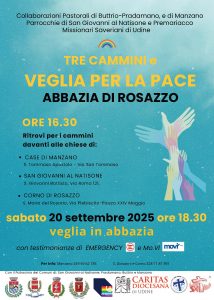 Le collaborazioni pastorali di Buttrio-Pradamano, Manzano e le parrocchie di San Giovanni al Natisone e Premariacco insieme ai missionari saveriani vivranno sabato 20 settembre 2025 l’esperienza «Tre cammini e veglia per la pace».