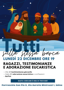 “Tutti sulla stessa barca”: un appuntamento di testimonianza rivolto ai ragazzi. Lunedi 22 dicembre 2025 presso la chiesa di San Pio X in Via Aurelio Mistruzzi 1 a Udine, a partire dalle ore 19.00 si inizierà con una testimonianza giovanile, a seguire adorazione eucaristica con possibilità di confessioni per terminare con un momento insieme con buffet.