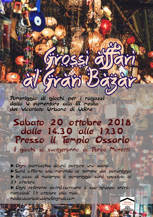 Il pomeriggio di sabato 20 ottobre sarà decisamente speciale per i ragazzi 10-13enni delle Parrocchie del Vicariato Urbano di Udine. A partire dalle 14.30, infatti, essi saranno invitati a entrare nel clima dei «Grossi affari al gran bazar», un pomeriggio intero di giochi e animazione organizzato dal “Gruppo medie” del Vicariato Urbano di Udine. Il ritrovo è fissato nella Parrocchia di San Nicolò al Temio ossario, ma l’animazione si svolgerà nell’attiguo Parco “Foni”, meglio noto come “Parco Moretti”. Anche il termine delle attività – previsto con la merenda delle 17.30 – avrà luogo nei locali della Parrocchia.