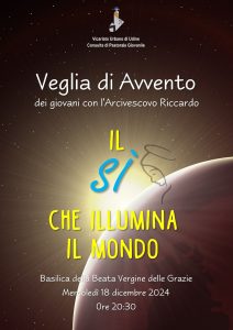 In preparazione alla celebrazione del Natale, la Pastorale Giovanile del Vicariato Urbano propone una Veglia nel cuore della Novena del Natale. La veglia intitolata “Il sì che illumina il mondo” si svolgerà il 18 dicembre 2024 presso il Santuario della Madonna delle Grazie alle 20.30 e presieduta dall’Arcivescovo Riccardo.